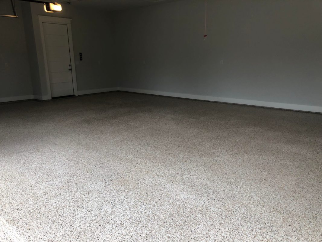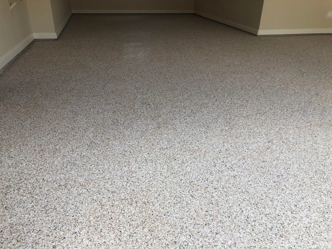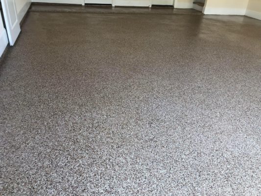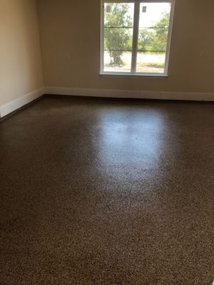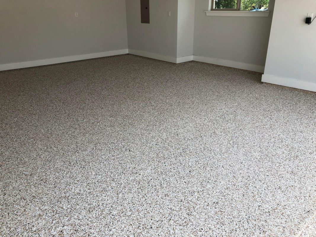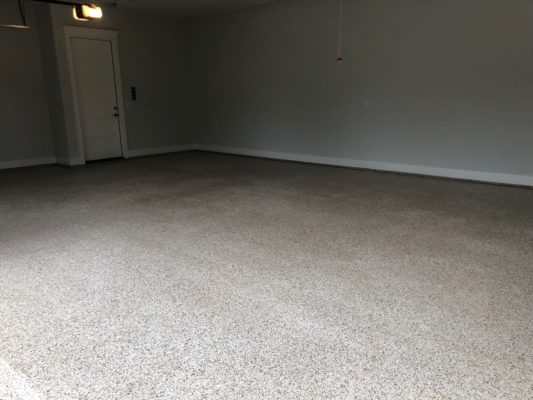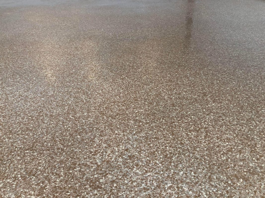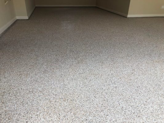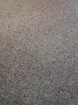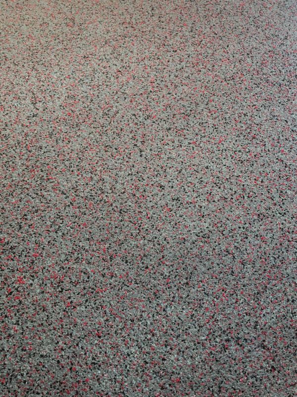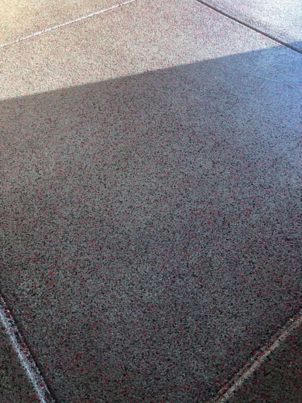 This is usually done on garage floors where we prep the existing concrete, use 100% solid epoxy, Cover 100% broadcast with multi colored paint chips in 1/4″ standard, Then topcoat with a durable urethane.