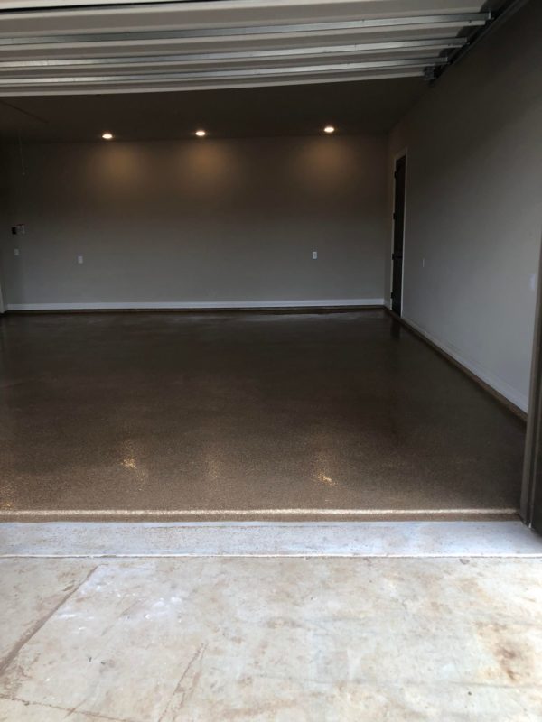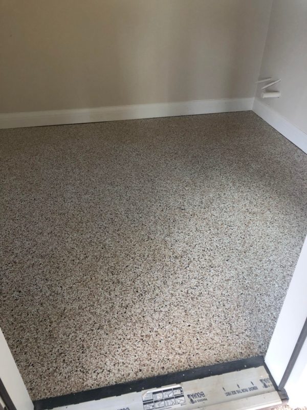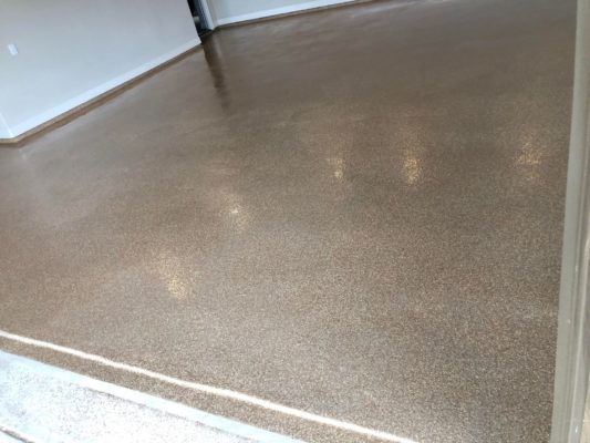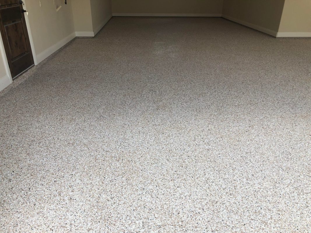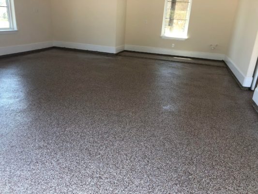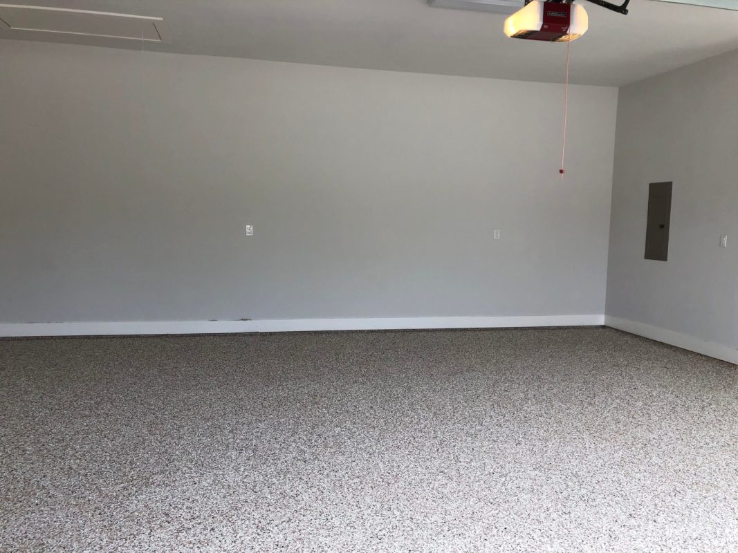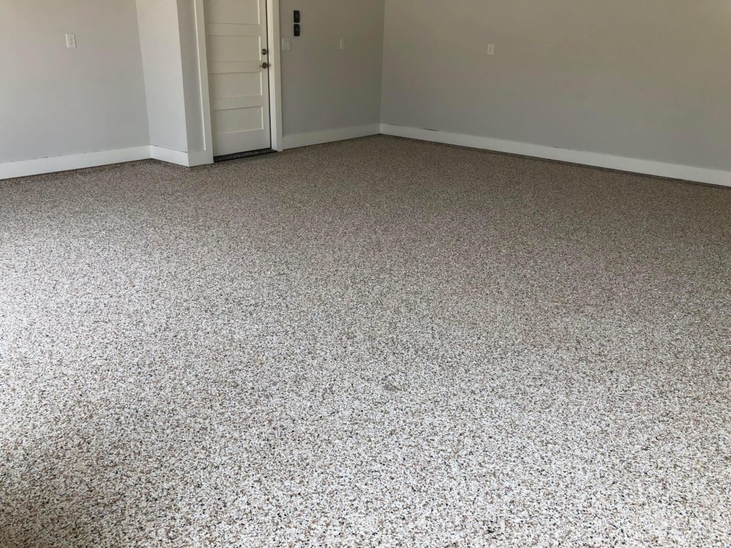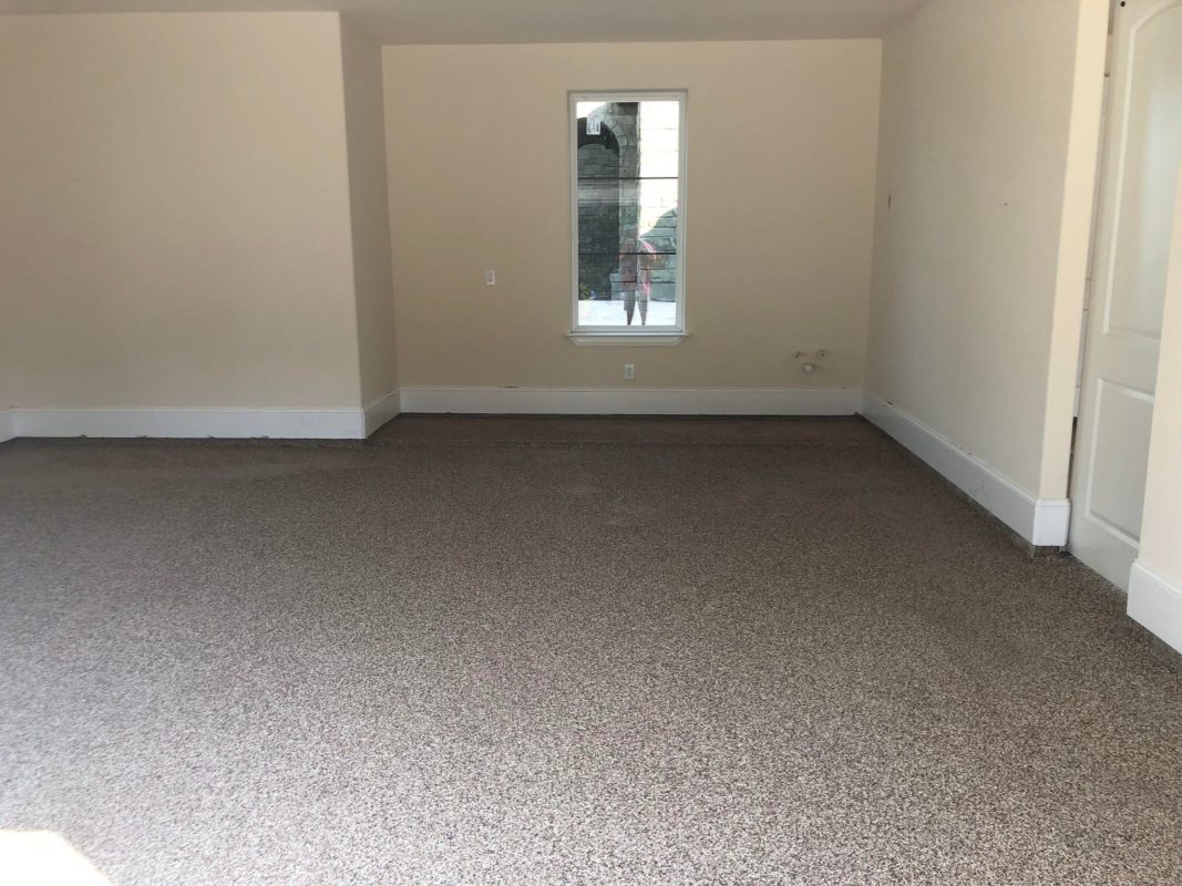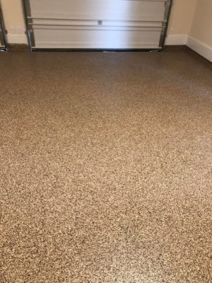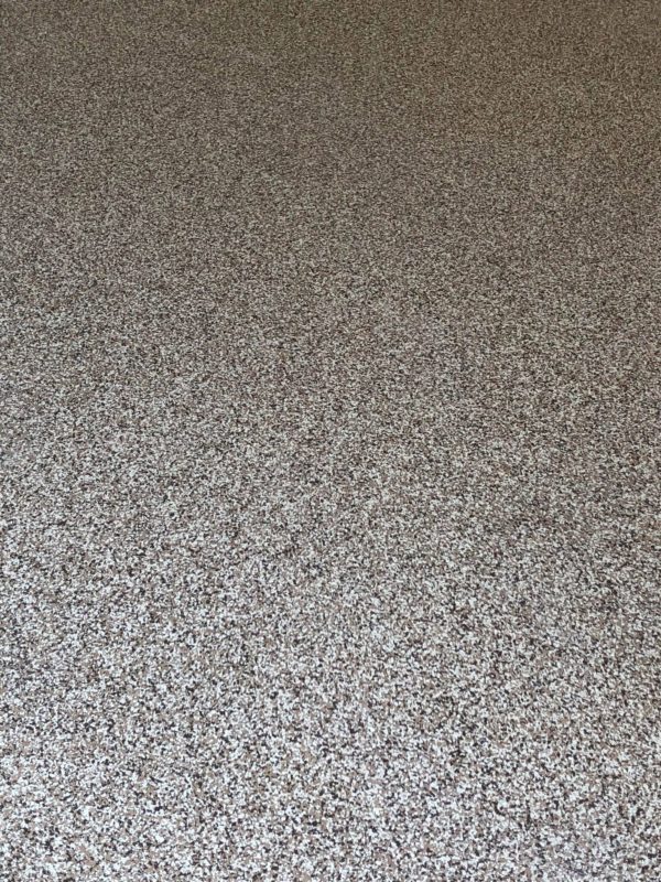 This is usually done on garage floors where we prep the existing concrete, use 100% solid epoxy, Cover 100% broadcast with multi colored paint chips in 1/4″ standard, Then topcoat with a durable urethane.