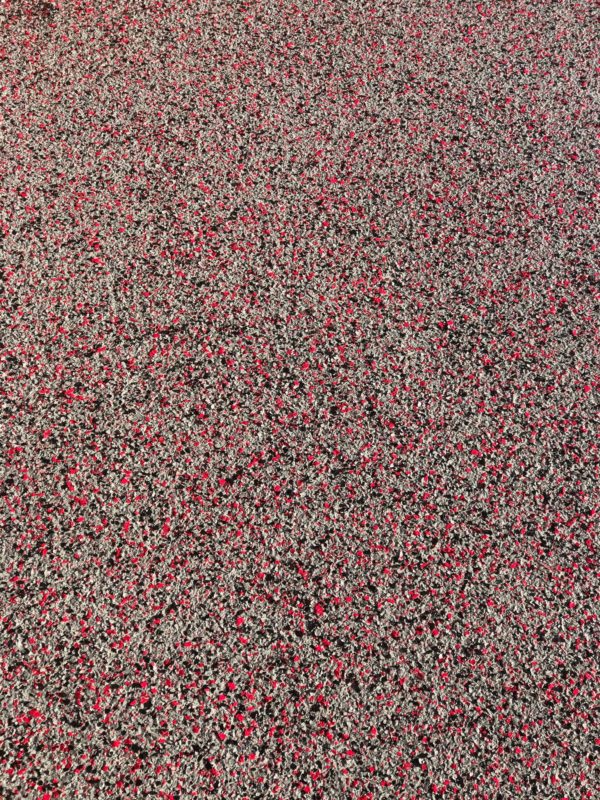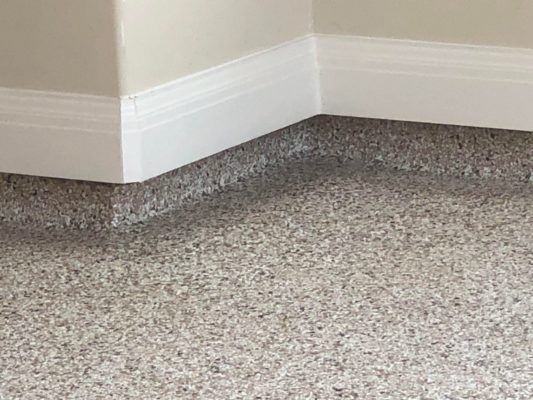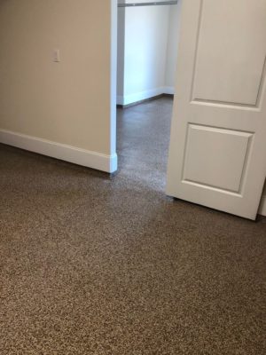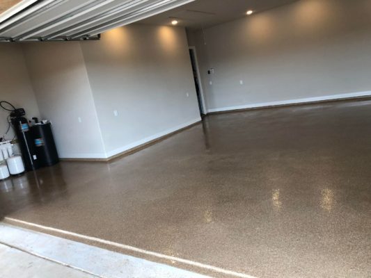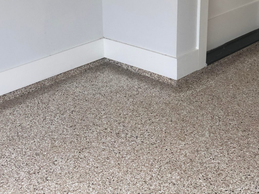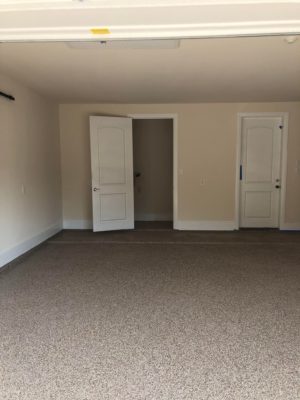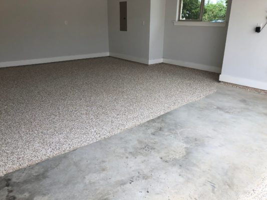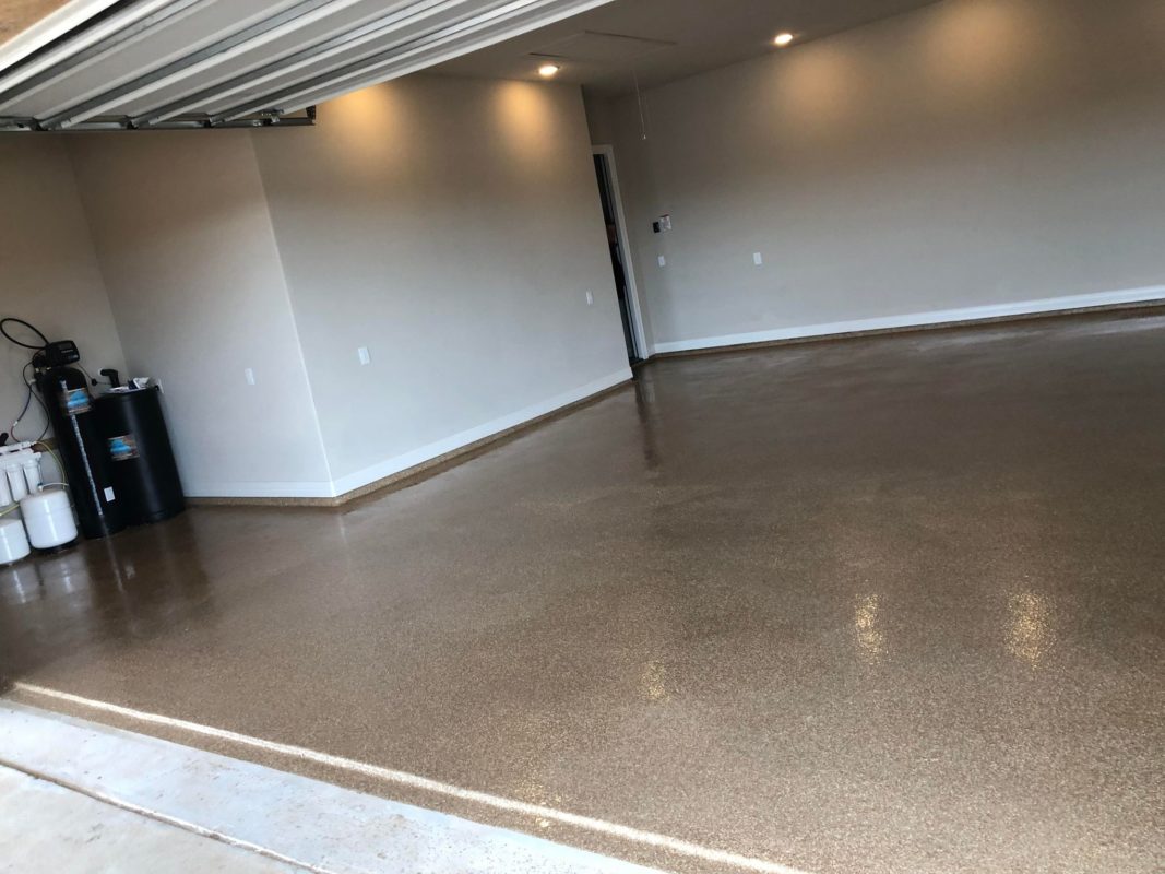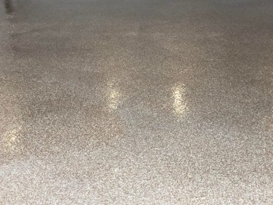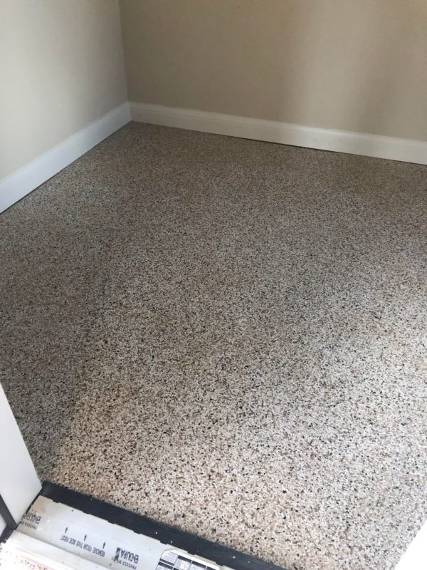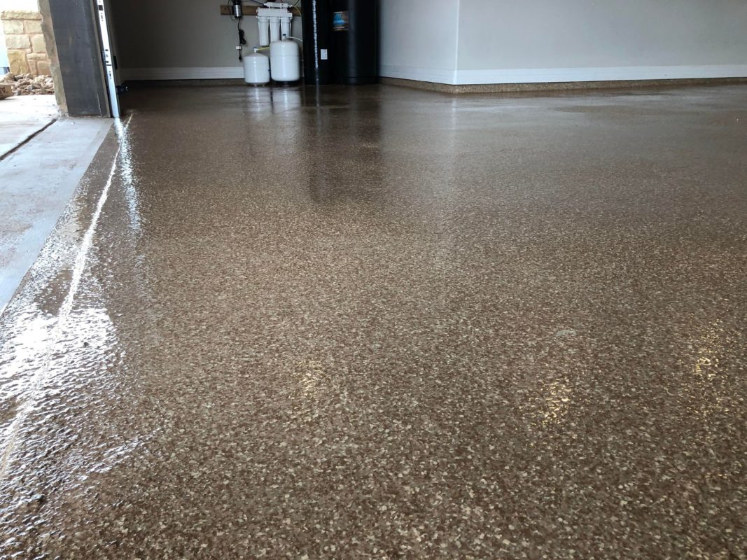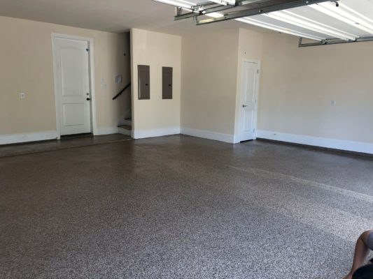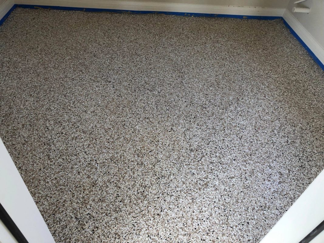 This is usually done on garage floors where we prep the existing concrete, use 100% solid epoxy, Cover 100% broadcast with multi colored paint chips in 1/4″ standard, Then topcoat with a durable urethane.